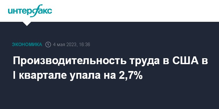 Москва. 4 мая. INTERFAX.RU - В I квартале 2023 года производительность труда в США упала на 2,7%, свидетельствуют предварительные данные Министерства труда страны. Стоимость рабочей силы выросла на 6,3%.