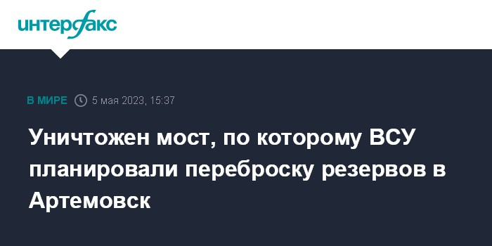 Москва. 5 мая. INTERFAX.RU - Российские военные уничтожили в районе Часова Яра (ДНР) мост, по которому армия Украины планировала осуществить подвоз боеприпасов и переброску резервов в Артемовск (Бахмут), заявил официальный представитель Минобороны РФ Игорь Конашенков.