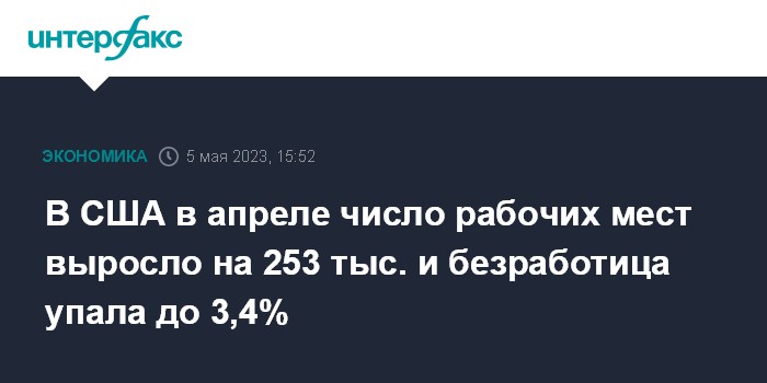 Москва. 5 мая. INTERFAX.RU - В апреле 2023 года количество рабочих мест в американской экономике увеличилось на 253 тысячи, сообщило Министерство труда США.