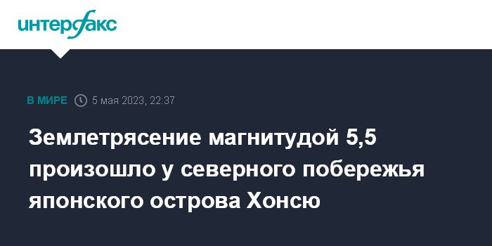Москва. 5 мая. INTERFAX.RU - Сейсмологи зафиксировали землетрясение магнитудой 5,5, которое произошло к северо-востоку от побережья японского острова Хонсю, сообщает телеканал NHK.