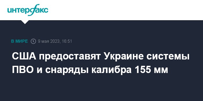 Москва. 9 мая. INTERFAX.RU - США в рамках очередного пакета военной помощи Украине на сумму $1,2 млрд направят ей системы ПВО и боеприпасы к ним, а также 155-миллиметровые артиллерийские снаряды, говорится в пресс-релизе Пентагона.