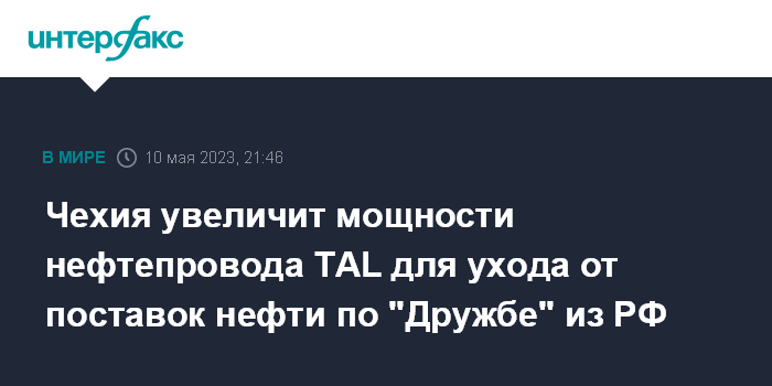 Москва. 10 мая. INTERFAX.RU - Чехия намерена снизить зависимость от поставок нефти по российскому трубопроводу "Дружба" посредством увеличения мощности трансальпийского нефтепровода TAL в 2024 году. Об этом сообщает агентство ЭФЭ со ссылкой на заявление чешского премьера Петра Фиалы.