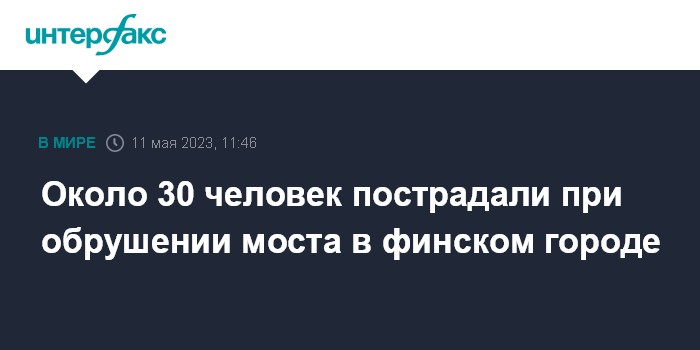 Москва. 11 мая. INTERFAX.RU - Около 30 человек пострадали в четверг в финском городе Эспоо в результате обрушения моста, сообщает телеканал Yle со ссылкой на местную полицию.