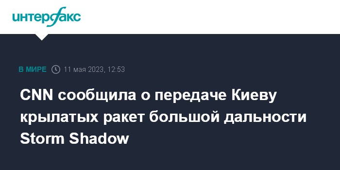 Москва. 11 мая. INTERFAX.RU - Великобритания предоставила Украине крылатые ракеты большой дальности и малой степени заметности Storm Shadow, которые в основном являются оружием воздушного базирования, сообщает телекомпания CNN со ссылкой на нескольких западных чиновников.