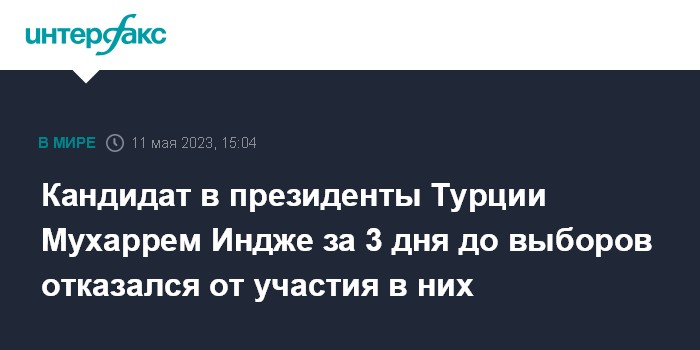 Москва. 11 мая. INTERFAX.RU - Кандидат на пост главы турецкого государства от Партии Отчизны Мухаррем Индже в четверг отказался от участия в президентских выборах, которые пройдут через три дня, сообщает Daily Sabah.