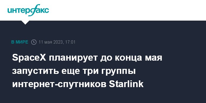 Москва. 11 мая. INTERFAX.RU - Американская компания SpaceX планирует до конца мая осуществить запуски на орбиту еще трех партий мини-спутников для пополнения орбитальной группировки глобальной сети интернет-покрытия системы Starlink, следует из данных специализированного издания Spaceflight Now.