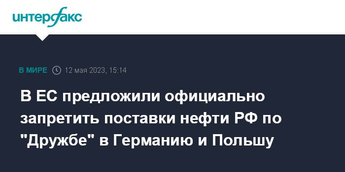 Москва. 12 мая. INTERFAX.RU - В ЕС предложили в рамках готовящегося 11-го пакета санкций против РФ запретить поставлять российскую нефть по трубопроводу "Дружба" в Германию и Польшу, сообщает в пятницу Bloomberg со ссылкой на оказавшиеся в его распоряжении документы.