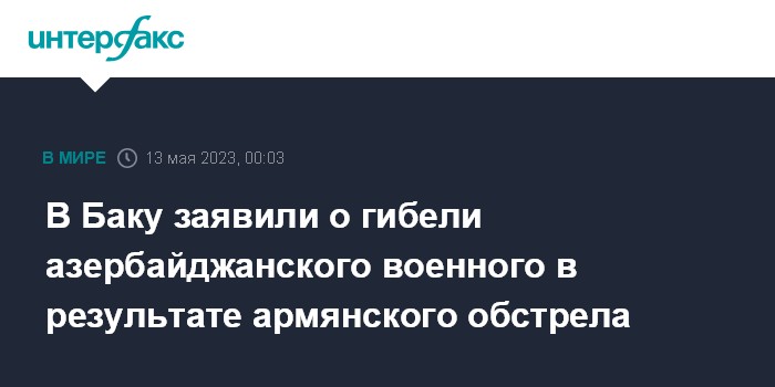 Москва. 13 мая. INTERFAX.RU - Министерство обороны Азербайджана сообщило в пятницу о гибели военнослужащего в результате обстрела с армянской стороны на границе.