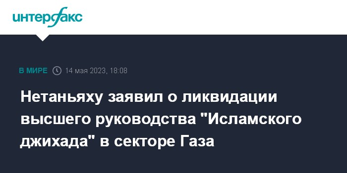 Москва. 14 мая. INTERFAX.RU - Израильские военные в ходе авиаударов за последние дни в секторе Газа уничтожили всё высшее руководство военизированного палестинского формирования "Исламский джихад", пишет Times of Israel со ссылкой на премьер-министра Израиля Биньямина Нетаньяху.