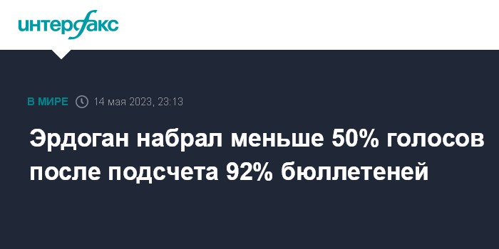 Москва. 14 мая. INTERFAX.RU - На президентских выборах в Турции по итогам подсчета 92% бюллетеней президент Реджеп Тайип Эрдоган набрал 49,86% голосов, а лидер оппозиции Кемаль Кылычдароглу - 44,38%.