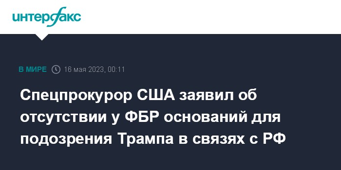 Москва. 16 мая. INTERFAX.RU - У американских спецслужб по итогам выборов 2016 года не было оснований для начала расследования о предполагаемых связях экс-президента Дональда Трампа с Россией, сообщает CNN со ссылкой на опубликованный в понедельник доклад американского спецпрокурора Джона Дарема.