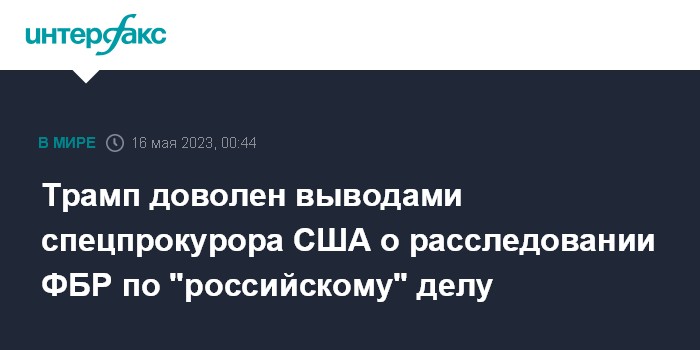 "После тщательного расследования спецпрокурор США Джон Дарем заключает, что ФБР не следовало запускать проверку в отношении связей между Трампом и Россией. Другими словами, американская общественность была обманута, точно так же, как она и обманывается в настоящий момент теми, кто не хочет видеть процветание для Америки", - написал Трамп в соцсети Truth Social.