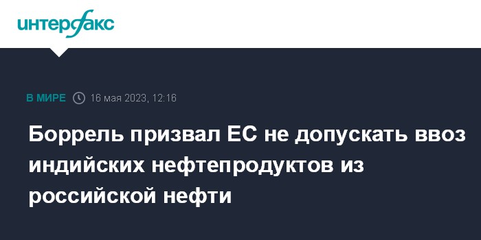 Москва. 16 мая. INTERFAX.RU - Евросоюз должен принять меры против перепродажи Индией российской нефти после ее переработки, в том числе в дизтопливо, на фоне ужесточения санкций против российского энергетического сектора, заявил Financial Times высокий представитель ЕС по иностранным делам Жозеп Боррель.