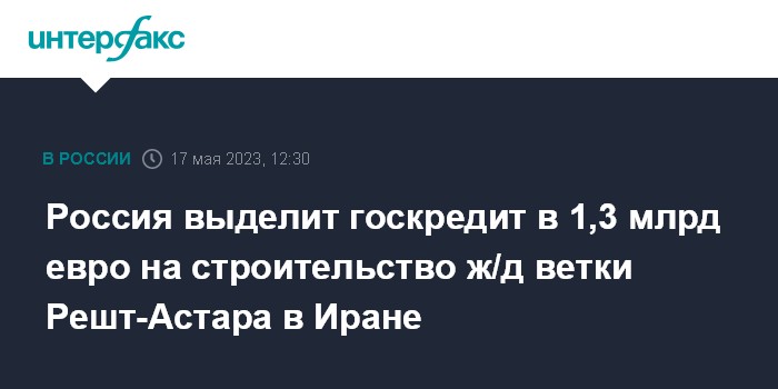 Москва. 17 мая. INTERFAX.RU - РФ выделит межгосударственный кредит на 1,3 млрд евро для строительства железнодорожной ветки Решт-Астара, сообщил журналистам в Тегеране вице-премьер Александр Новак.