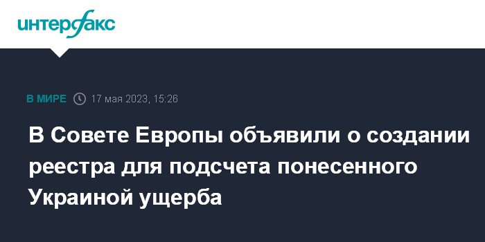 Москва. 17 мая. INTERFAX.RU - Участники организованного Советом Европы саммита в Рейкьявике объявили в среду о создании специального реестра для хранения информации об ущербе, понесенном Украиной в ходе российской спецоперации.