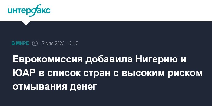 Москва. 17 мая. INTERFAX.RU - Европейская комиссия (ЕК) объявила в среду, что обновила список третьих стран с высоким уровнем риска в части "стратегических недостатков" в их режимах борьбы с отмыванием денег и финансированием терроризма, добавив Нигерию и ЮАР.