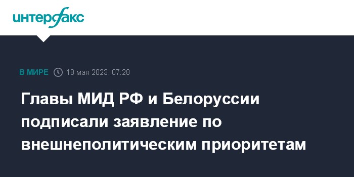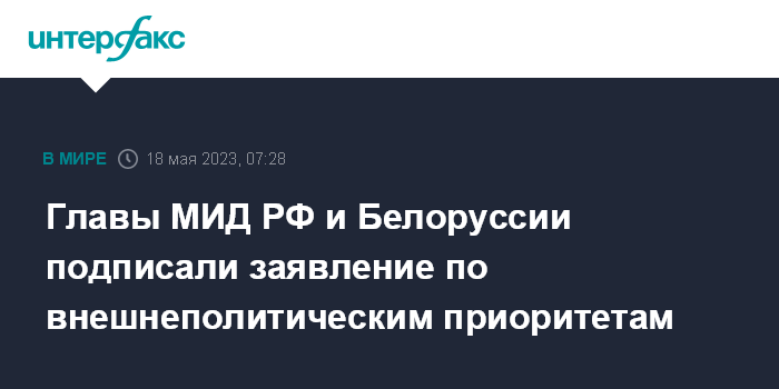 Москва. 18 мая. INTERFAX.RU - Главы министерств иностранных дел России и Белоруссии подписали совместное заявление по общим внешнеполитическим приоритетам стран, сообщила пресс-служба российского посольства в Минске.