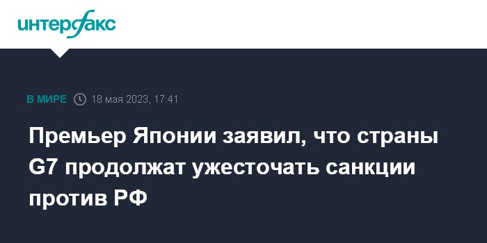 Москва. 18 мая. INTERFAX.RU - Страны G7 будут и дальше вести политику ужесточения санкционного режима в отношении РФ и поддержки Украины, заявил премьер-министр Японии Фумио Кисида накануне начала саммита "группы семи" в Хиросиме.
