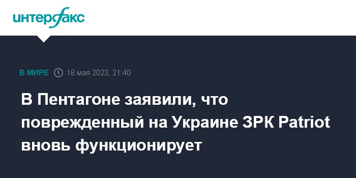 Москва. 18 мая. INTERFAX.RU - Зенитный ракетный комплекс (ЗРК) Patriot производства США пострадал от ракетного удара на Украине, но повреждения уже устранили, и ЗРК вернулся в строй, заявила представитель Пентагона Сабрина Сингх.