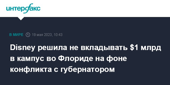 Disney решила не вкладывать $1 млрд в кампус во Флориде на фоне конфликта с губернатором