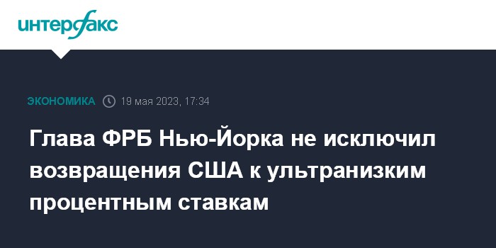 Москва. 19 мая. INTERFAX.RU - Экономика США может однажды вернуться к ультранизким процентным ставкам, считает президент Федерального резервного банка Нью-Йорка Джон Уильямс. Как пишет MarketWatch, он высказал это мнение, выступая на конференции.