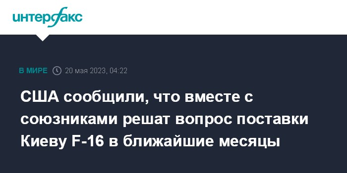 Москва. 20 мая. INTERFAX.RU - Вопрос о поставках Украине истребителей F-16 будет решен в ближайшие месяцы, сообщил на брифинге советник президента США по нацбезопасности Джейк Салливан.