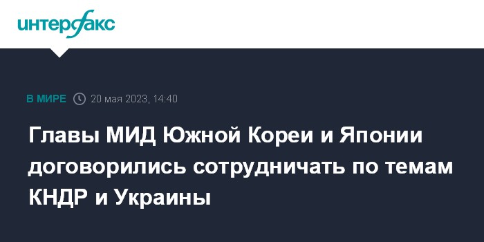 Москва. 20 мая. INTERFAX.RU - Главы МИД Южной Кореи и Японии Пак Чин и Ёсимаса Хаяси договорились "на полях" саммита G7 в Хиросиме о том, что Сеулу и Токио вместе с США необходимо более тесно сотрудничать по ситуации вокруг КНДР и Украины, сообщило агентство Yonhap.