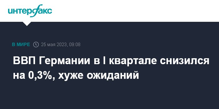 Москва. 25 мая. INTERFAX.RU - ВВП Германии в первом квартале 2023 года снизился на 0,3% по сравнению с предыдущими тремя месяцами, согласно окончательным данным Федерального статистического агентства ФРГ (Destatis).