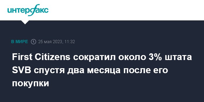 Москва. 25 мая. INTERFAX.RU - Американский First Citizens Bank, новый владелец активов потерпевшего крах в марте этого года Silicon Valley Bank (SVB), сократил порядка 500 сотрудников, или около 3% штата SVB.