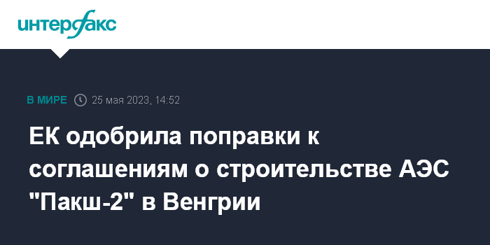 Москва. 25 мая. INTERFAX.RU - Еврокомиссия одобрила поправки к соглашениям о строительстве АЭС "Пакш-2". Об этом говорится в опубликованном на сайте АЭС сообщении со ссылкой на заявление главы МИД Венгрии Петера Сийярто.