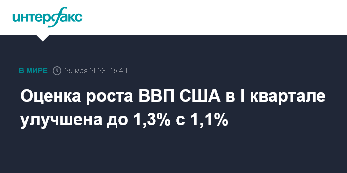 Москва. 25 мая. INTERFAX.RU - Экономика США в первом квартале выросла на 1,3% в пересчете на годовые темпы, свидетельствуют пересмотренные данные министерства торговли США.