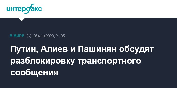 Москва. 25 мая. INTERFAX.RU - Вопросы разблокирования транспортного сообщения будут обсуждаться на трехсторонней встрече президентов России Владимира Путина, Азербайджана Ильхама Алиева и премьер-министра Армении Никола Пашиняна.