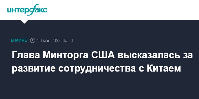 Москва. 26 мая. INTERFAX.RU - США выступают за продолжение сотрудничества и подержание открытых линий связи с Китаем, заявила американский министр торговли Джина Раймондо на встрече в Вашингтоне с министром коммерции КНР Ван Вэньтао.