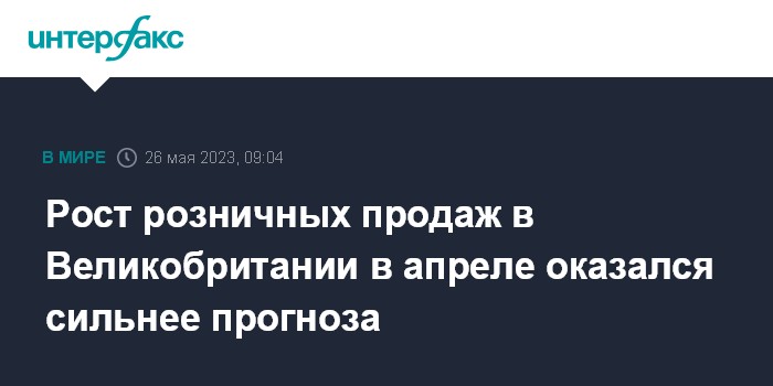 Москва. 26 мая. INTERFAX.RU - Розничные продажи в Великобритании в апреле выросли на 0,5% по сравнению с предыдущим месяцем. Об этом свидетельствуют данные Национального статистического управления (ONS) страны.