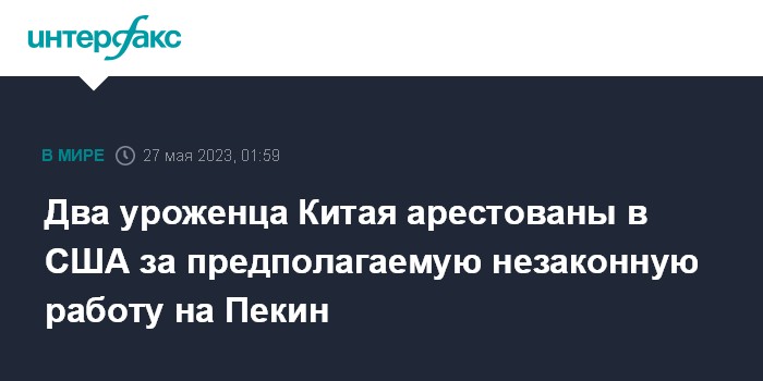 Москва. 27 мая. INTERFAX.RU - Минюст США сообщил об аресте двух уроженцев Китая, которым предъявлен иск в связи с предполагаемой незаконной деятельностью в США под контролем властей КНР.