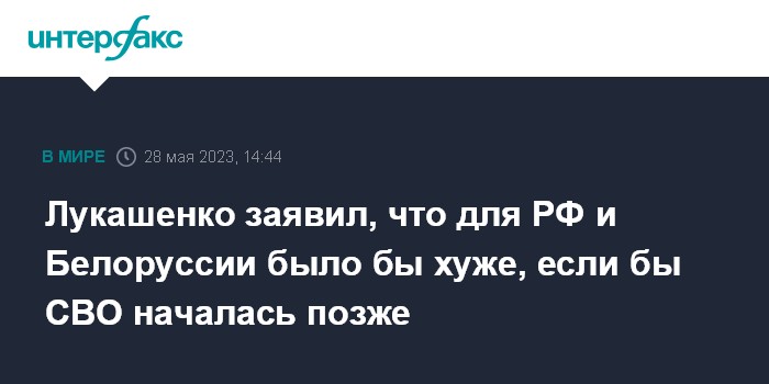 Москва. 28 мая. INTERFAX.RU - Специальная военная операция на Украине является лишь деталью в глобальном противостоянии за многополярность мира, и если бы она началась позже, то имела бы гораздо более неприятные последствия для Москвы и Минска, считает президент Белоруссии Александр Лукашенко.