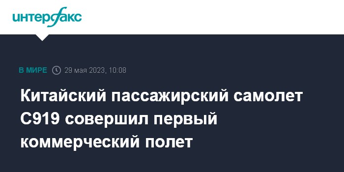 Москва. 29 мая. INTERFAX.RU - Китайский пассажирский авиалайнер C919 совершил первый коммерческий полет в минувшее воскресенье.