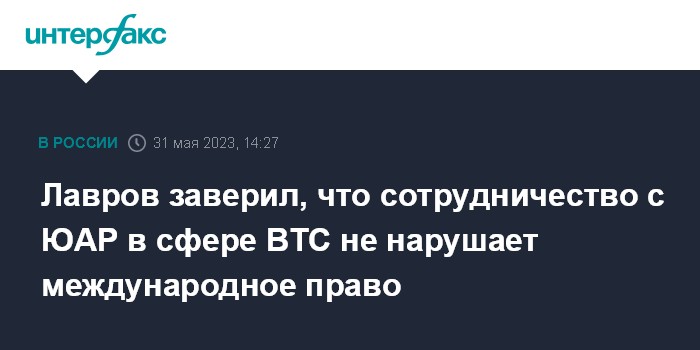 Москва. 31 мая. INTERFAX.RU - Сотрудничество России и ЮАР, в том числе в военно-технической сфере, соответствует нормам и принципам международного права, заявил глава МИД Сергей Лавров, комментируя слова посла США в Южной Африке Рубена Бригетти о том, что ЮАР якобы поставляет вооружение российской армии.