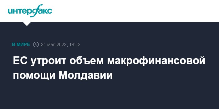 Москва. 31 мая. INTERFAX.RU - ЕС увеличит размер макрофинансовой помощи Молдавии почти в три раза – до 1,6 млрд евро с 600 млн евро. Обэтом сообщила глава Еврокомиссии Урсула фон дер Ляйен на пресс-конференции в Кишиневе в среду.