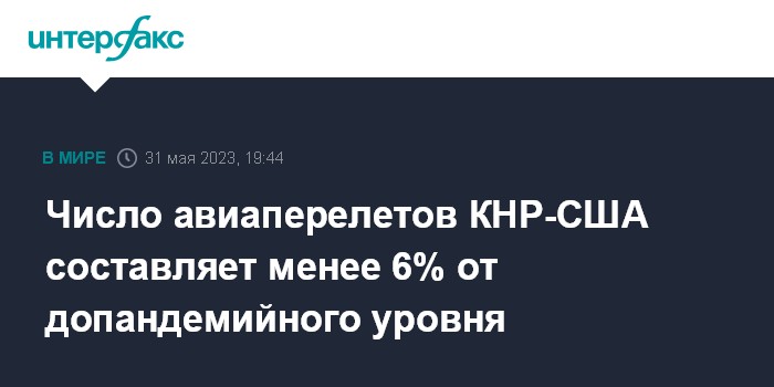 Москва. 31 мая. INTERFAX.RU - С учетом отмены ковид-ограничений возобновлено менее 6% авиарейсов между США и материковым Китаем, которые существовали в 2019 году, сообщается в отчете Nomura, основанном на данных Variflight.
