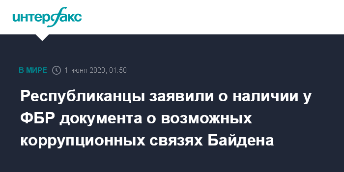 "В ходе нашего разговора директор ФБР Кристофер Рэй подтвердил существование документа FD-1023, в котором утверждается, что Байден, тогда занимавший пост вице-президента, был вовлечен в криминальную коррупционную схему, связанную с иностранным гражданином", - говорится в заявлении Комера, опубликованном в соцсети.