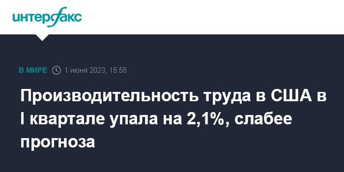 Москва. 1 июня. INTERFAX.RU - Производительность труда в США в первом квартале упала на 2,1%, согласно окончательным данным министерства труда страны.
