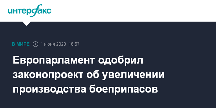 Москва. 1 июня. INTERFAX.RU - Европейский парламент (ЕП) проголосовал в четверг на своей пленарной сессии в Брюсселе в поддержку законопроекта об увеличении производства боеприпасов и ракет в ЕС.