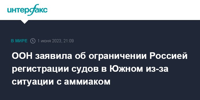 Москва. 1 июня. INTERFAX.RU - Россия довела до сведения Совместного координационного центра (СКЦ) об ограничениях по регистрации судов, следующих в украинский порт Южный, пока не возобновится экспорт российского аммиака. Об этом сообщил в четверг представитель генсека ООН Стефан Дюжаррик.