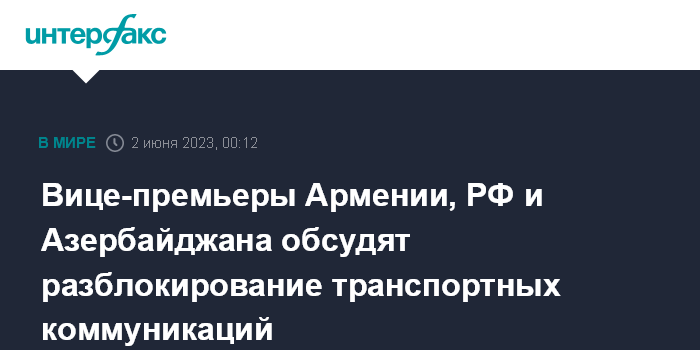Москва. 2 июня. INTERFAX.RU - Встреча вице-премьеров Армении, Азербайджана и России по вопросу разблокирования региональных транспортных коммуникаций состоится 2 июня в Москве, заявил премьер Армении Никол Пашинян.