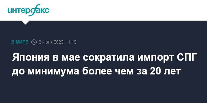 Москва. 2 июня. INTERFAX.RU - Импорт сжиженного природного газа Японией в мае снизился до минимального уровня более чем за 20 лет. Об этом сообщает Bloomberg со ссылкой на официальную статистику и данные о движении танкеров.