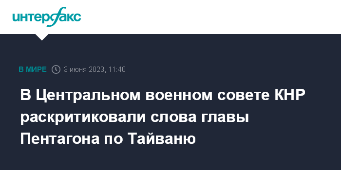 Москва. 3 июня. INTERFAX.RU - Заявления главы Пентагона Ллойда Остина по ситуации вокруг Тайваня искажают истинную картину событий, заявил замначальника Объединенного штаба Центрального военного совета КНР генерал-лейтенант Цзин Цзяньфэн. Его слова приводит South China Morning Post.