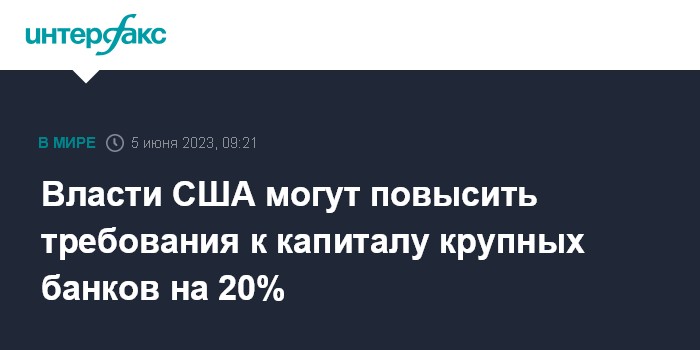 Москва. 5 июня. INTERFAX.RU - Американские регуляторы в июне предложат повысить общие требования к достаточности капитала крупных банков в среднем примерно на 20%, пишет The Wall Street Journal.