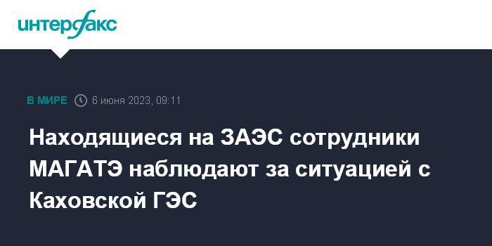 Москва. 6 июня. INTERFAX.RU - Находящиеся на Запорожской АЭС эксперты МАГАТЭ внимательно следят за происходящем с Каховской ГЭС, плотина которой была частично разрушена утром 6 июня.
