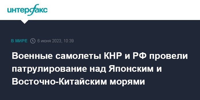 Москва. 6 июня. INTERFAX.RU - Военная авиация КНР и РФ во вторник совершила совместные патрульные полеты над Японским и Восточно-Китайским морями, сообщает Channel NewsAsia со ссылкой на заявление китайского министерства обороны.
